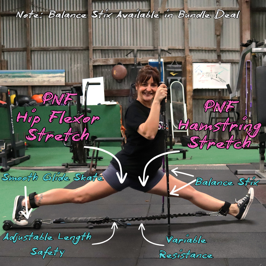 Improve your splits almost immediately. Actively stretch hamstrings, hip flexors and groin quickly, easily and most importantly effectively with PNF style stretching. Stretch through both split positions, front split and middle split. Even if you aren't looking at getting your splits just working these positions will drastically improve the mobility in your hips. Have you ever seen a dancer or gymnast who had poor mobility?